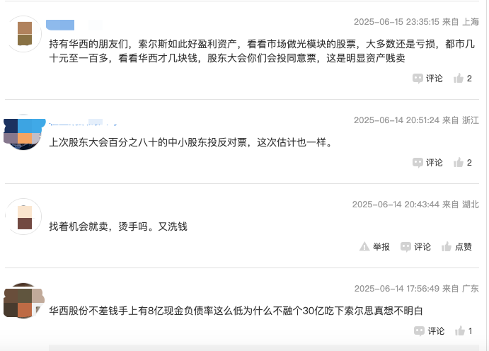 网上已经出现了些不同的声音。有网友称,索尔思是个盈利的资产,“这明显是资产贱卖”;华西股份为何不“吃下”索尔思,真不明白。