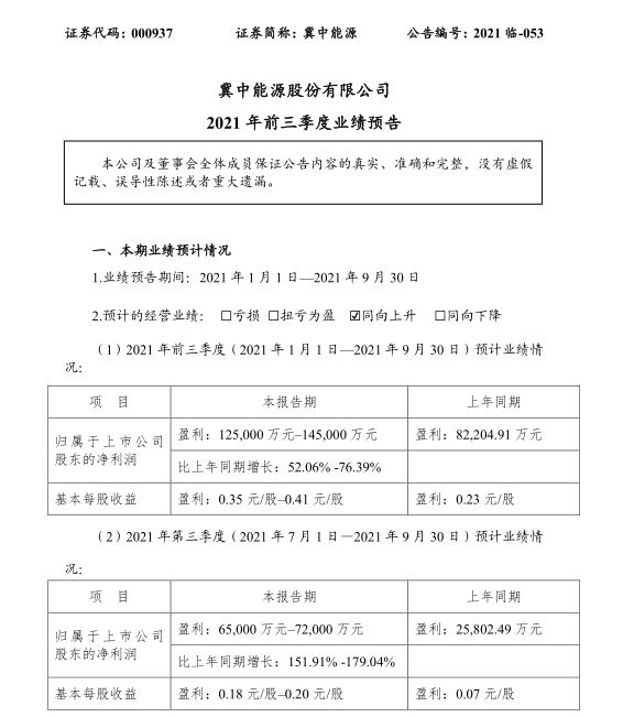 冀中能源公告,前三季净利润12.5亿元~14.5亿元,比上年同期增长52.06%~76.39%。第三季度净利润6.5亿元~7.2亿元,比上年同期增长151.91%~179.04%。今年以来,主要产品销售价格上涨,煤炭市场三季度以来持续高位运行,企业效益同比增长较高。