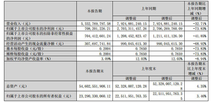 国际能源网获悉,近日,冀中能源发布2024年一季度报告。2024年第一季度,公司实现营业收入53.33亿元,同比下降32.71%;实现净利润7.08亿元,同比下降73.83%;扣非净利润7.04亿元,同比增加41.85%;经营活动产生的现金流量净额3.08亿元,同比减少68.92%%;基本每股收益0.2004元,同比增加73.83%;加权平均净资产收益率3.09%,同比减少8.94%。