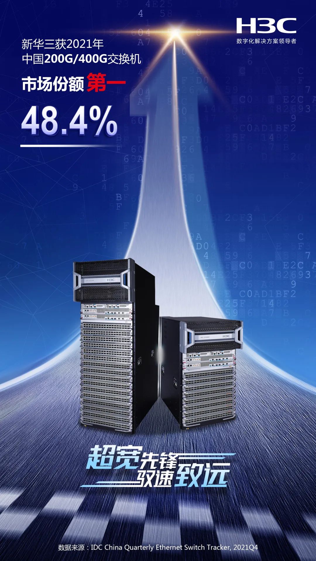 近日,国际数据公司(IDC)全新发布《中国以太网交换机市场季度跟踪报告(2021Q4)》,紫光股份旗下新华三集团以48.4%的占比高居中国200G/400G交换机市占率第一名,持续领跑中国市场。