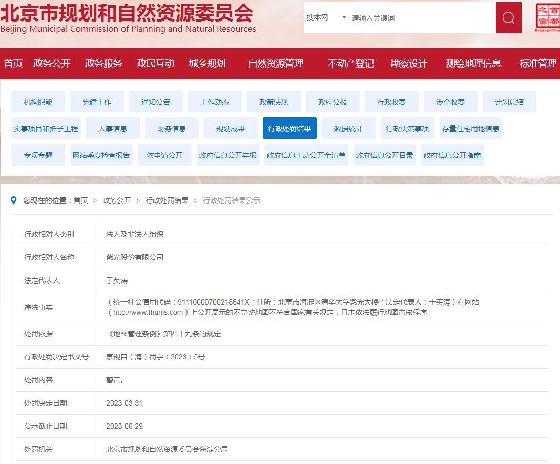 行政处罚结果显示,紫光股份有限公司在网站(http://www.thunis.com)上公开展示的不完整地图不符合国家有关规定,且未依法履行地图审核程序。