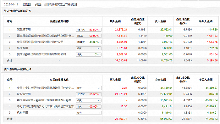 具体来看,机构买入2978.34万元,卖出9799.91万元,合计净卖出6821.57万元。此外,中国中金财富证券有限公司北京建国门外大街证券营业部、深股通专用分别卖出4.45亿元、2.25亿元;深股通专用、国泰君安证券上海新闸路证券营业部分别买入2.17亿元、4811.62万元。