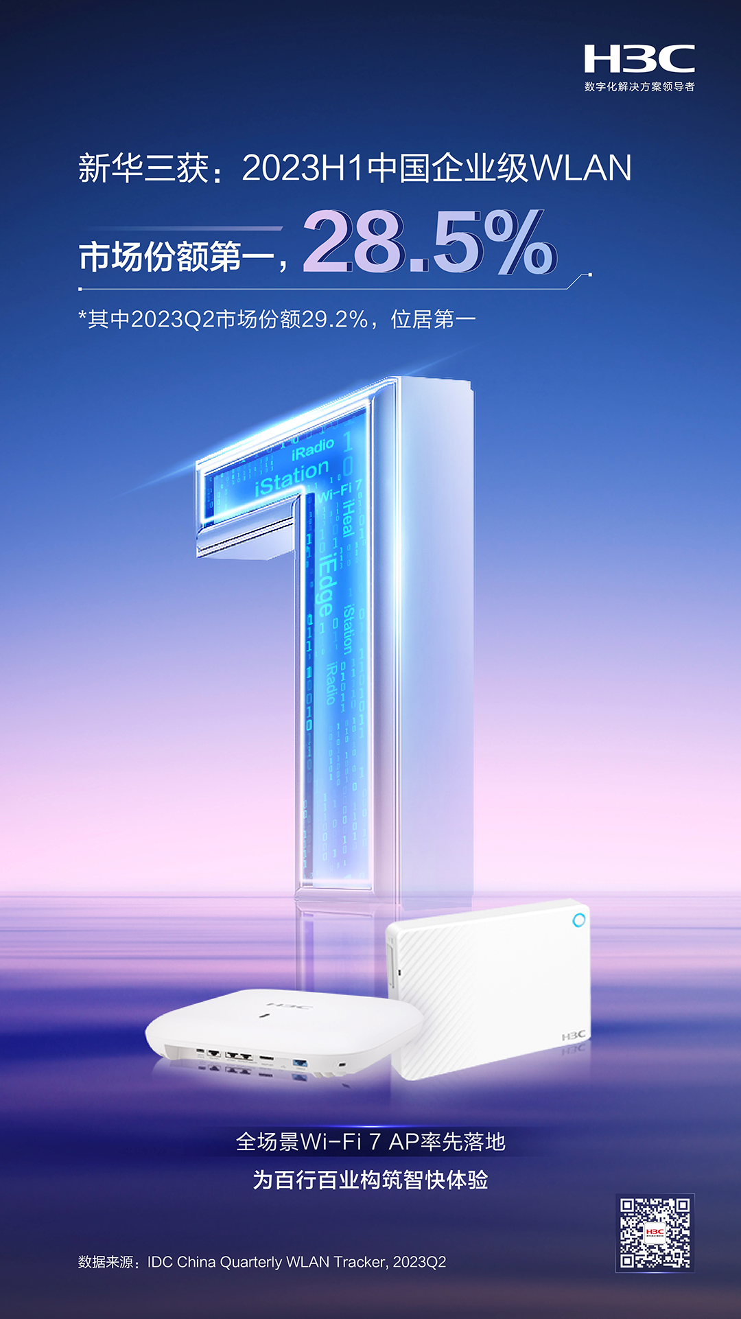 日前,根据国际数据公司IDC发布的《中国WLAN市场季度跟踪报告(2023Q2)》显示,紫光股份旗下新华三集团以28.5%的份额,斩获2023年第二季度中国企业级WLAN市场第一。凭借持续不断的技术创新、产品迭代和落地实践,新华三集团已连续14年稳居企业级WLAN市场前列,成为行业市场的实力领航者。