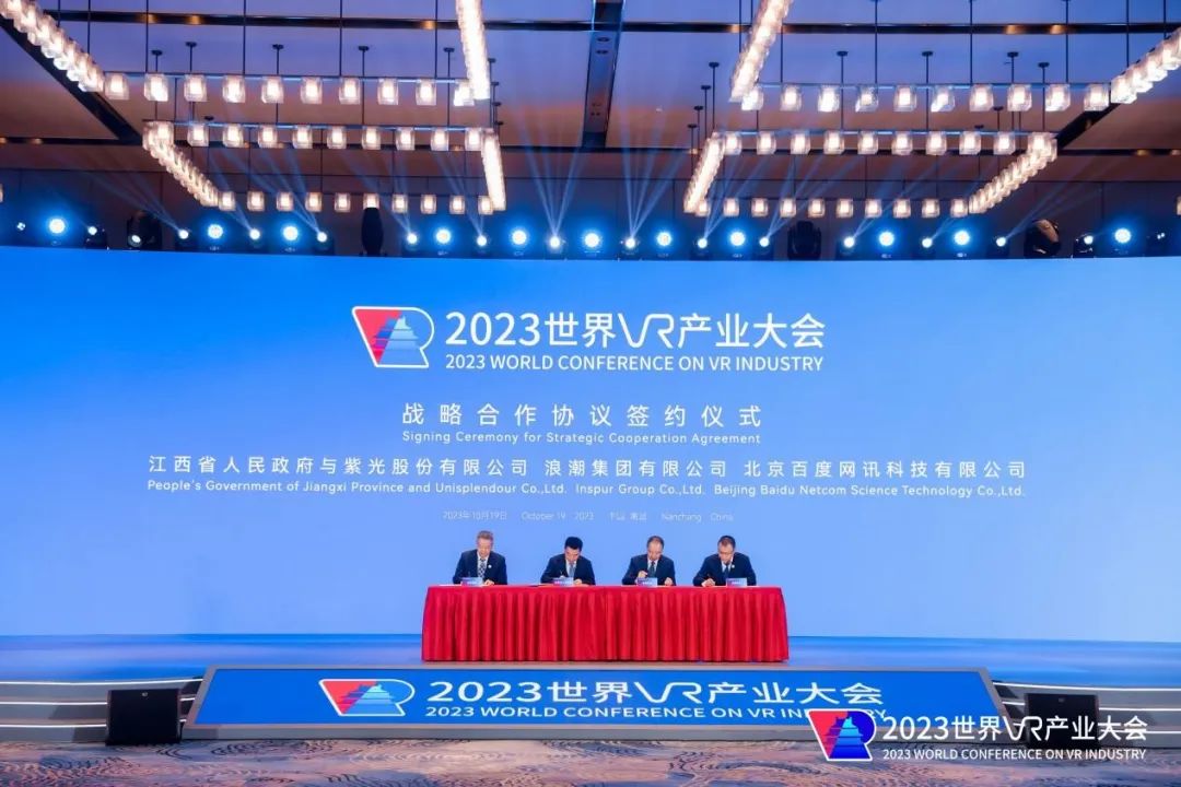 10月19日,2023世界VR产业大会于江西南昌盛大开幕。紫光股份董事长、新华三集团总裁兼首席执行官于英涛受邀出席开幕式并发表主题演讲。期间,江西省人民政府与紫光股份有限公司共同签订了战略合作协议,江西省人民政府副省长夏文勇与紫光股份总裁王竑弢出席并签约。
