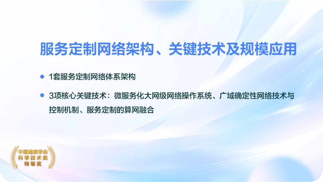 本项目研究成果面向互联网下半场生产型业务、数字经济、东数西算战略等对网络的差异性服务、确定性服务等需求挑战,在国际上率先原创性提出服务定制网络(SCN)新型体系架构,突破了微服务化大网级网络操作系统。
