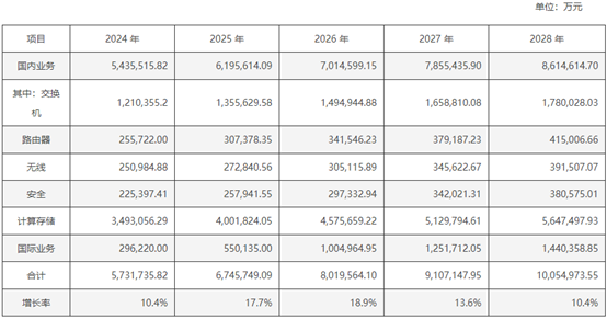 细分业务来看,预测2024-2028年,新华三的每个业务收入均保持稳定增长。