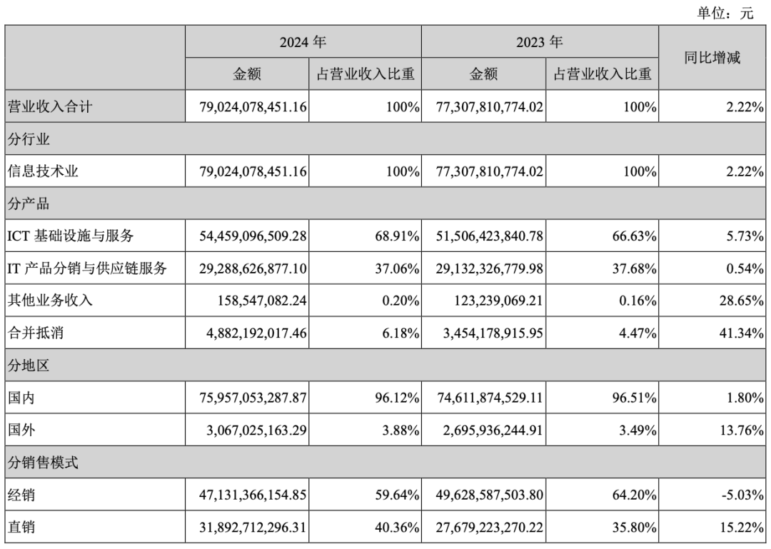紫光股份 2024 年营收 790.24 亿,同比增长 2.22%;净利润 15.72 亿,同比减少 25.23%。