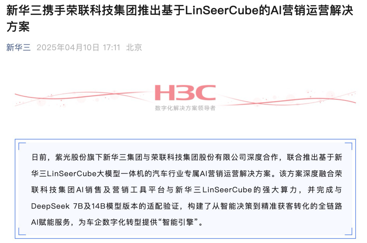DeepSeek加速AI应用落地,助力客户打通AI落地“最后一公里”,新华三推出业界首个“智算-算法-治理”深度耦合的DeepSeek大模型一体机——LinSeer Cube。