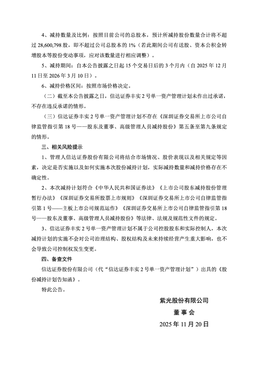 持有紫光股份有限公司 157,304,393 股(占总股本的比例为 5.50%)的股东信达证券-天津信恒同邦企业管理合伙企业(有限合伙)-信达证券丰实 2 号单一资产管理计划(以下简称“信达证券丰实 2 号单一资产管理计划”)计划在本公告披露之日起 15 个交易日后的 3 个月内通过集中竞价方式减持不超过 28,600,798 股(约占总股本的 1.00%)。