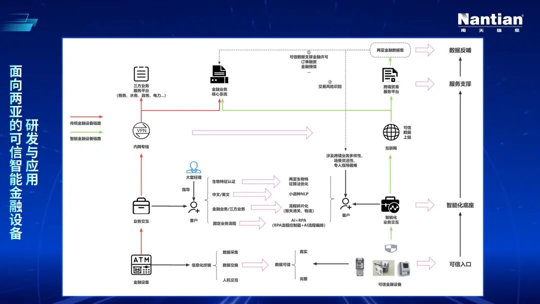 可信智能金融设备解决方案基于多架构的可信工控机设备,构建了云边协同的自适应安全防御机制,通过创新性地融合多源数据和智能生物识别技术,为跨境金融交易提供全方位安全保障。另外,南天信息针对两亚地区的特点,开发了多模态识别技术和边缘端精准部署功能,赋能区域金融安全与贸易畅通。