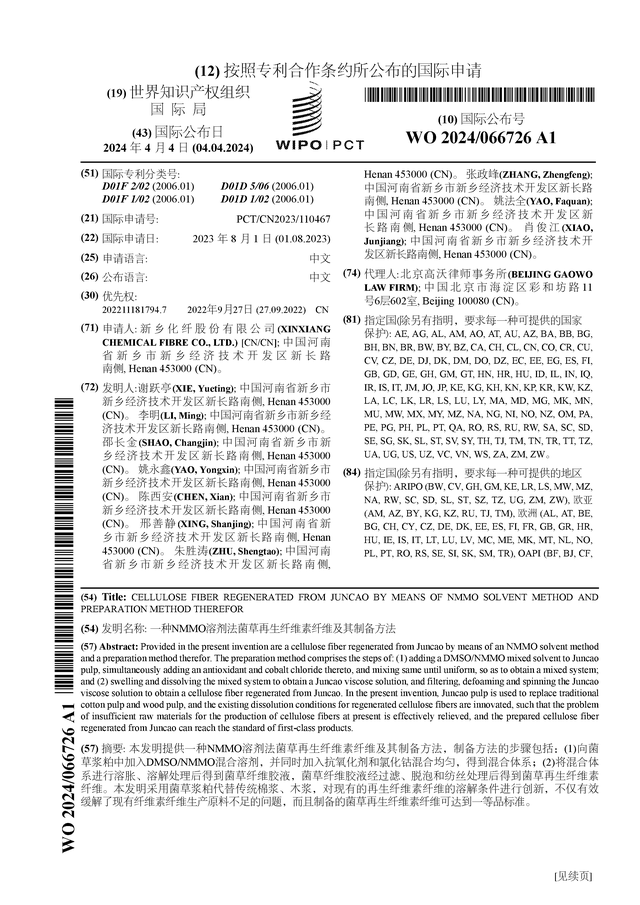 数据显示新乡化纤(000949)公布了一项国际专利申请,专利名为“一种NMMO溶剂法菌草再生纤维素纤维及其制备方法”,专利申请号为PCT/CN2023/110467,国际公布日为2024年4月4日。
