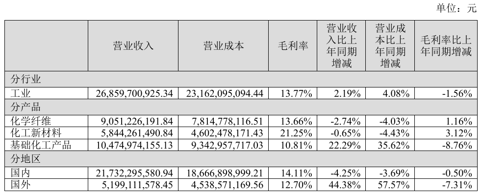 总营收的同比提升主要来源于基础化工产品(主要为己二酸)的贡献。华峰化学国外营收51.99亿元,同比提升44.38%,占总营业收入的19.31%。