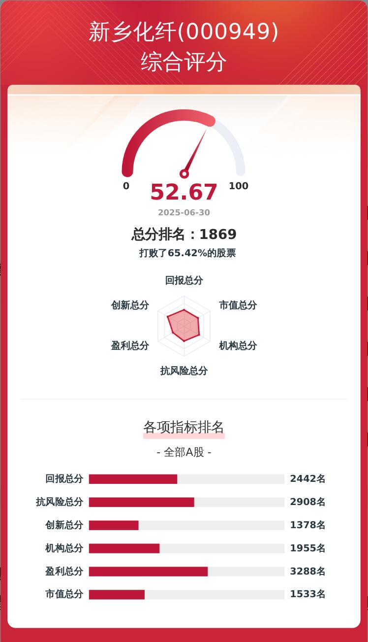 新乡化纤在多个维度上的得分情况显示,其在回报、创新、盈利、抗风险、机构和市值等方面的综合表现较为均衡。具体来看,该企业在创新维度上得分最高(62.59分),表明其研发投入较大且创新能力较强;而在抗风险维度上得分相对较低(49.37分)。整体而言,新乡化纤在各个评估维度中均处于中等偏上水平。