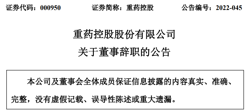 5月9日,重药控股发布公告称,丁长田因个人原因,申请辞去公司董事、董事会战略发展与投资委员会委员、董事会薪酬与考核委员会委员职务。