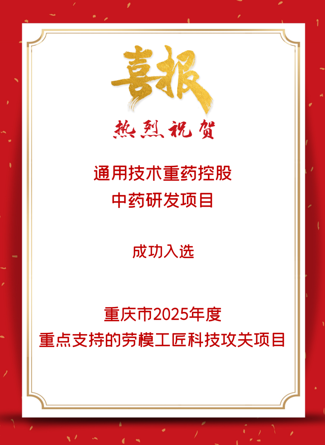 近日,重庆市总工会发布《关于2025年度重点支持的劳模工匠科技攻关项目的通知》,通用技术重药控股中药研发项目成功入选“2025年度重庆市重点支持的劳模工匠科技攻关项目”。