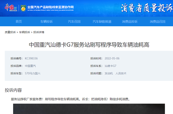 在中国网汽车质量投诉平台上,其中大部分案例都是有关乘用车方面投诉。然而,近来平台上接到了多例关于中国重汽汕德卡G7重卡车型的投诉,其中涉及到变速箱故障、油耗高等方面问题。