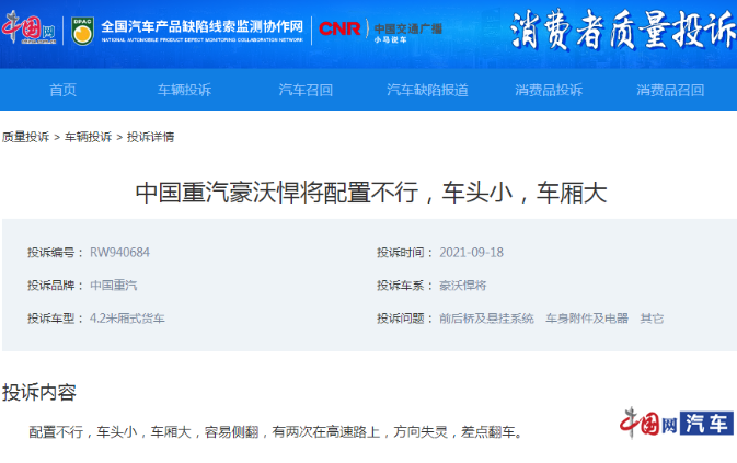此外,也有中国重汽豪沃悍将的车主投诉车辆车头小,车厢大,行驶过程中险些翻车。豪沃车型曾凭借“10吨王”而闻名,但这种超重的轻卡车型虽然可帮助车主获得更多利润,却也存在着严重的安全隐患。2019年,央视曾曝光了轻卡行业“大吨小标”乱象,中国重汽豪沃也遭到了车主的集体投诉,有车主表示,自己购买的豪沃悍将系列,标定整车重量2600kg,额定载重1560kg。但经交警重新称重发现,该车整车重量4000-4500kg不等,被视为违法车辆,无法上路行驶。另有重汽豪沃车主向记者投诉称,自己不想再驾驶这种存在安全隐患的车辆,并强调这种实际整车重量与行驶证不符,一旦出现交通事故,保险公司是有理由拒赔的,更有车主直指豪沃就是超重时代的鼻祖。