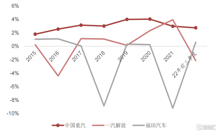而中国重汽的阿尔法属性,则体现在穿越周期的盈利能力。从投资角度来理解,阿尔法即跨越周期的绝对回报。若拉长时间周期来看,回顾近十年,恰好是一轮行业牛熊周期,即便是历史景气度低点和本轮商用车下行周期内,中国重汽都能实现持续盈利,盈利能力领先同业。