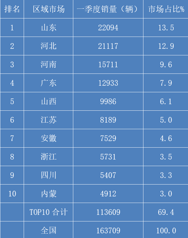 表:2023年一季度国内重卡终端市场TOP10区域销量统计(来源:终端上牌信息,不含出口根据)