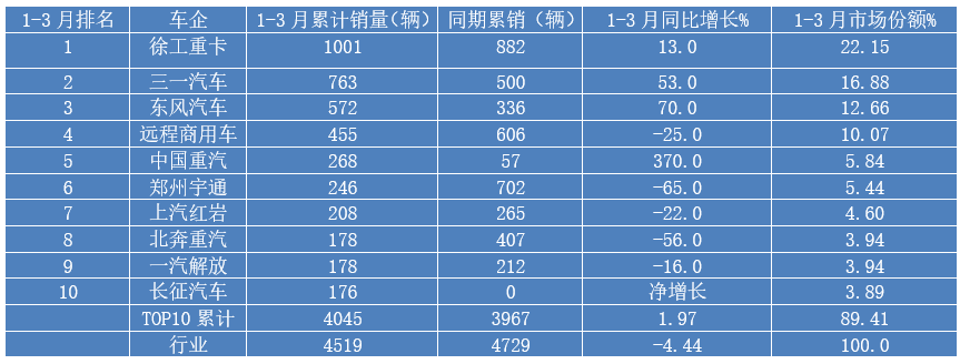 ---三一汽车累计销售763辆,同比增长53%;市场占比16.88%,居第二。
