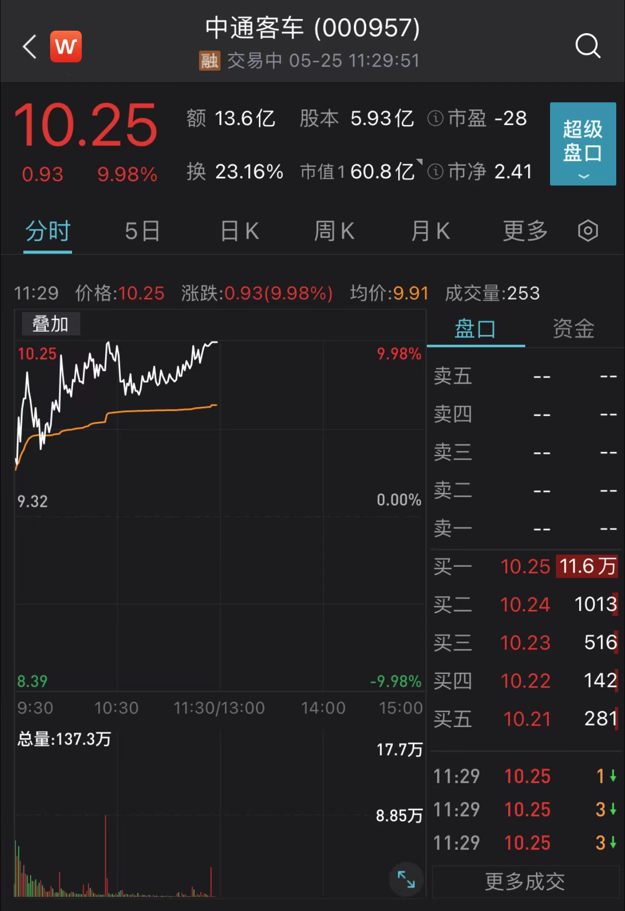 截至5月25日11:30,中通客车再度涨停,收获九连板,日内成交额近14亿元。