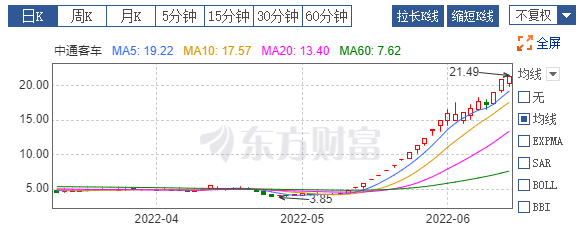 从5月初至6月22日,中通客车的股价已经连涨一个多月,股价涨幅高达400%,直接翻了4倍。