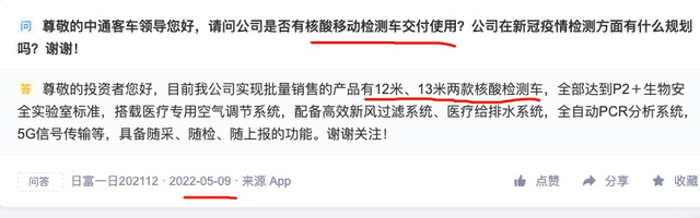 当我们回顾中通客车这波行情的过程就会发现,当时是依靠“核酸检测车概念”涨起来的,最早的时候中通客车在官网上发布了一则核酸检测车交付的新闻,然后在5月9号的时候有投资者在互动易上问董秘核酸检测车的情况,董秘也如实回复已经有核酸检测车销售。