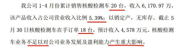 唯一有效的信息是详细披露了核酸检测的情况,1-4月销售了20台,营收6171万,占总营收的比例不到6%,截止5月底,在手订单为18台,预计收入4578万,这就意味着平均每辆核酸检测车的销售价格大概是250万到300万。