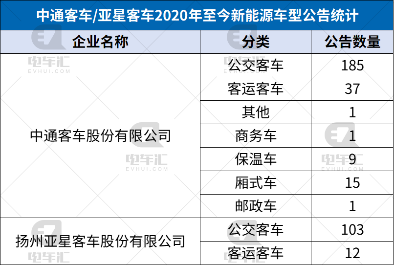 据电车汇统计,2020年以来,中通客车申报了249个新能源汽车公告,其中客车223个,货车25个,专项作业车1个。亚星客车申报了116个新车公告,均为客车。