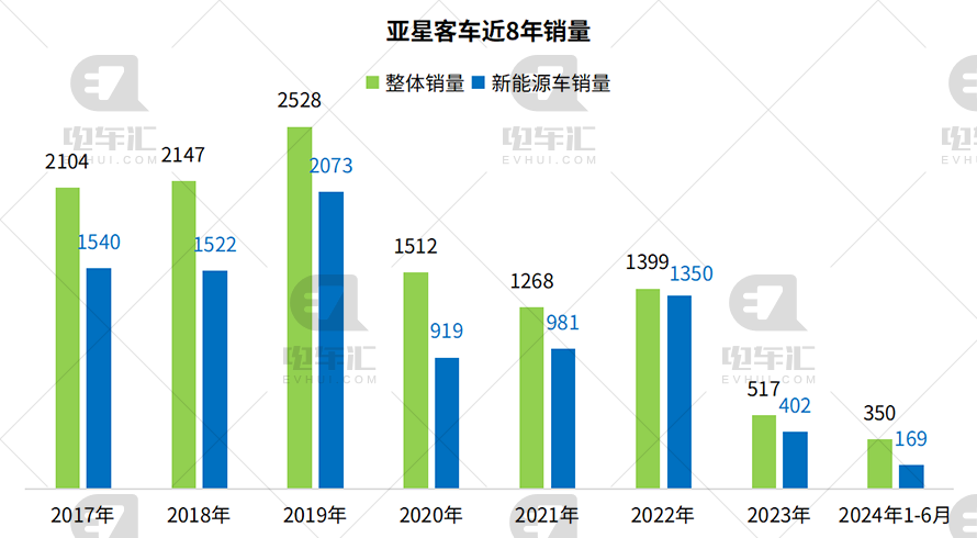 电车汇依据终端销量统计了亚星客车和中通客车近8年的市场表现,亚星客车在2020年以前年销量保持在2000辆以上,2020年开始明显下滑,2023年全年销量只有517辆,新能源车销量402辆。