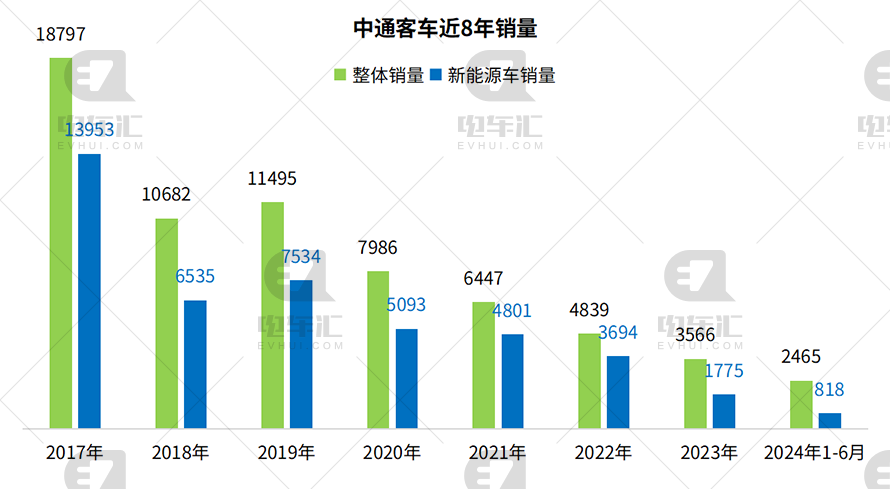 中通客车在2020年以前销量能够保持在万辆以上,2020年开始出现明显下滑,2023年全年销量为3566辆,新能源车销量1775辆。