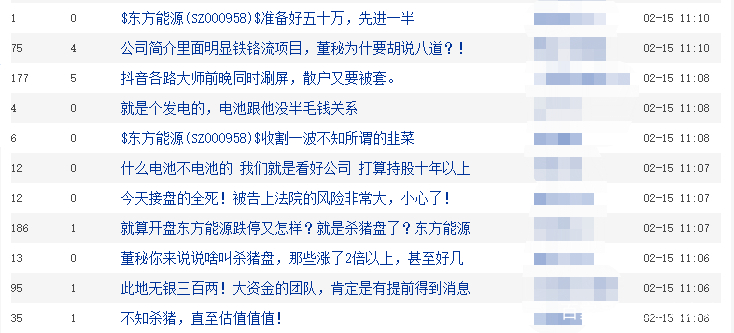 此外,在东方能源股吧里,不少投资者并不信任公司声明,并称“此地无银三百两!大资金的团队,肯定是有提前得到消息。”“公司简介里面明显铁铬流项目,董秘为什要胡说八道?!”还有投资者发帖表示:“董秘你来说说啥叫杀猪盘,那些涨了2倍以上,甚至好几倍的,然后叫散户接盘的,才算杀。”