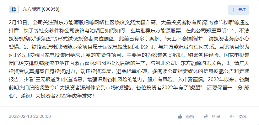 2月13日晚间,东方能源(000958)在深交所互动易上提示称,公司关注到东方能源股吧等网络社区热度突然大幅升高,大量投资者称有所谓“专家”“老师”等通过抖音、快手等社交软件称公司铁铬电池项目如何如何,密集推荐东方能源股票,在此公司郑重声明: