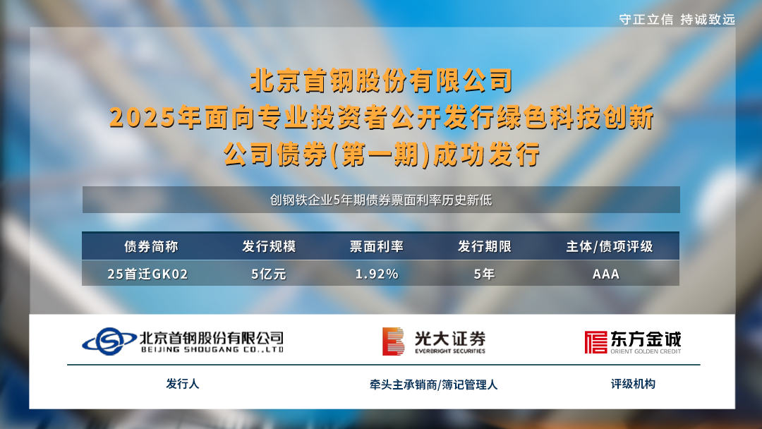 近日,由东方金诚评级,东方金诚信用提供第三方评估认证的“北京首钢股份有限公司2025年面向专业投资者公开发行绿色科技创新公司债券(第一期)”(以下简称“本期债券”)在深交所债券市场成功发行。本期债券发行规模5亿元,发行期限5年,票面利率1.92%,创钢铁企业5年期债券票面利率历史新低。