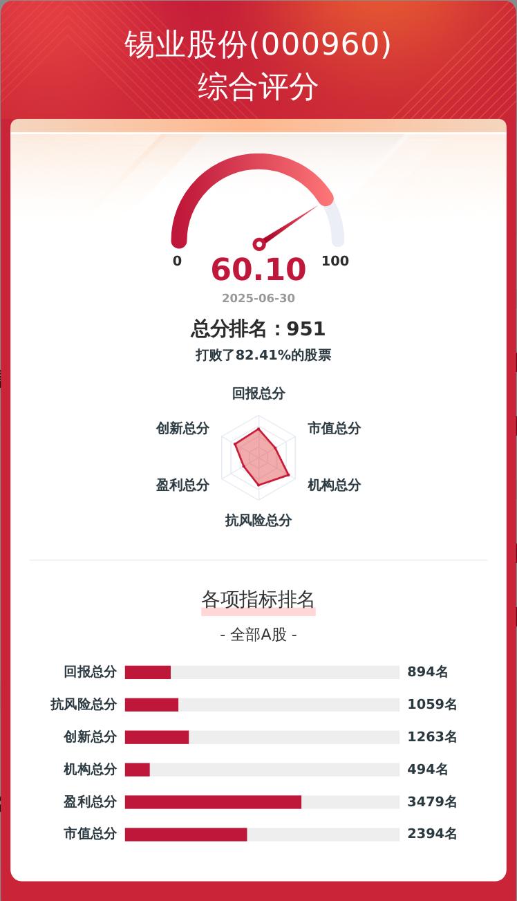 金融界上市公司研究院构建了一套上市公司韧性评价体系,从企业盈利、科技创新、股东回报、经营抗风险、市值表现及机构吸引力六个维度对企业进行量化评分,满分为100分。锡业股份的韧性评价总分为60.10分,在A股5405家可比上市公司中排名第951位。