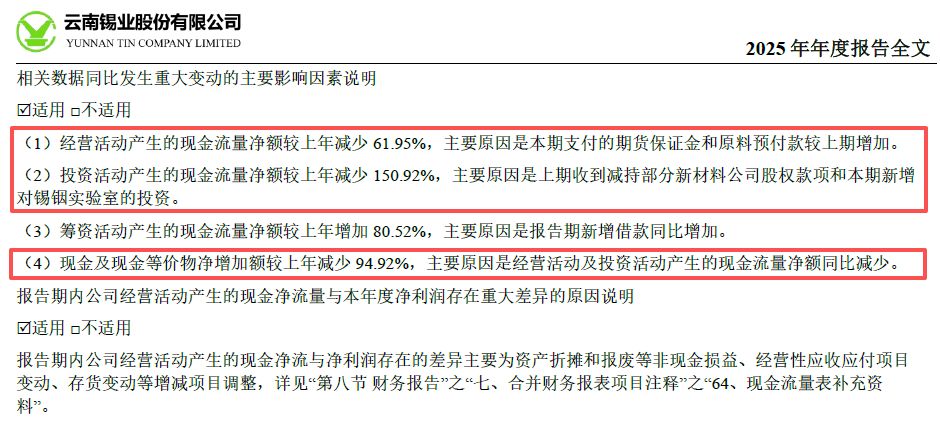 年报显示,锡业股份报告期内经营活动产生的现金流量净额较上年减少了61.95%至12.95亿元,公司称“主要原因是本期支付的期货保证金和原料预付款较上期增加”。