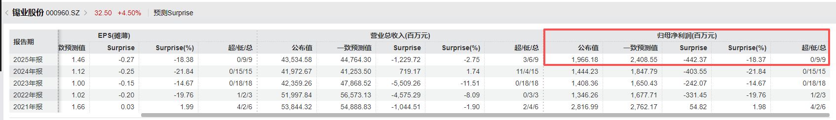 纵向来看,这是锡业股份营收在连续三年(2022年—2024年)的下滑后,重拾升势。另外,19.66亿元的归母净利润,创下2021年以来的单年新高。尽管如此,据万得金融终端汇编的数据,9家机构对锡业股份2025年归母净利润的一致预测值约为24.09亿元,因此按照公司披露的19.66亿元的数据来看,是不及预期的。公布值比一致预测值低了18.37%。