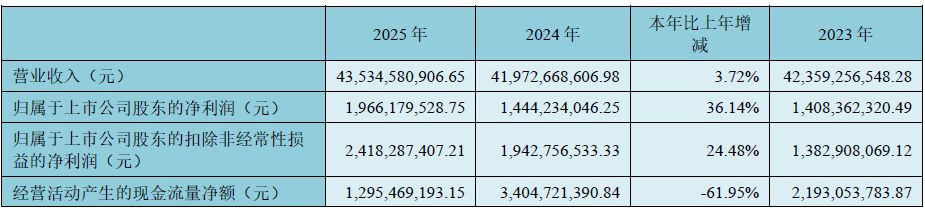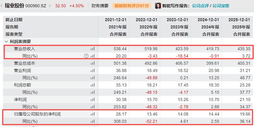 锡业股份(SZ000960,股价32.50元,市值534.77亿元)3月29日晚间披露2025年年报,公司2025年实现营收435.35亿元,同比增长3.72%;实现归属于上市公司股东的净利润19.66亿元,同比增长36.14%;实现扣非净利润约24.18亿元,同比增长24.48%;基本每股收益1.1561元。公司拟每10股派发现金2.5元,不送红股。
