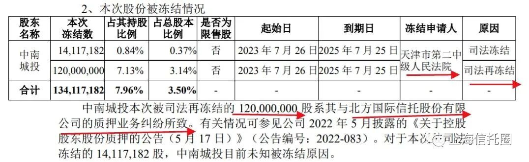 其中,中南城投本次被司法再冻结的120,000,000股系其与北方国际信托股份有限公司的质押业务纠纷所致,另对于本次被司法冻结的14,117,182股,中南城投目前未知被冻结原因。