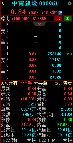 4月22日消息,中南建设一字涨停,截至发稿涨10.53%,报0.84元/股,成交额7457万元,换手率2.33%,总市值32.14亿元。