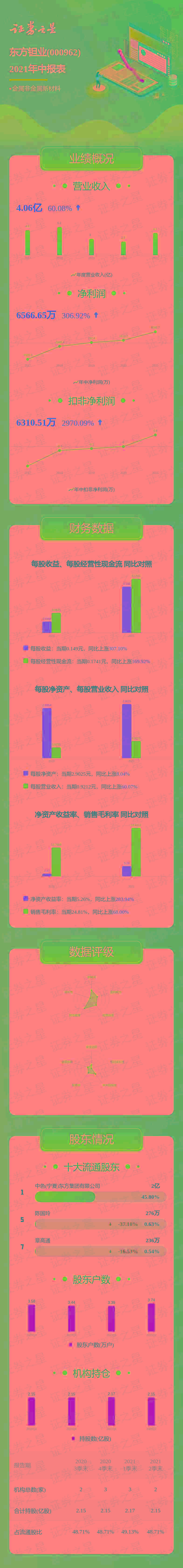 东方钽业(000962,股吧)2021中报显示,公司主营收入4.06亿元,同比上升60.08%;归母净利润6566.65万元,同比上升306.92%;扣非净利润6310.51万元,同比上升2970.09%;负债率18.02%,投资收益3388.67万元,财务费用589.01万元,毛利率24.81%。