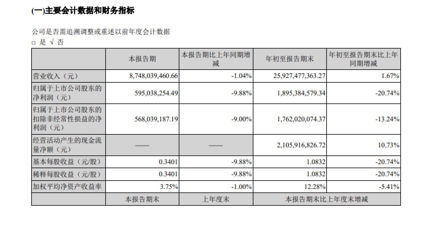 10月26日,华东医药(000963.SZ)发布公告称,2021年第三季度实现营收87.48亿元,同比降1.04%;实现净利润5.95亿元,同比降9.88%。