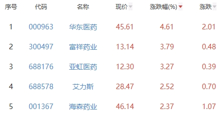 其中,华东医药、富祥药业、亚虹医药、艾力斯、海森药业位列板块涨幅前五位,涨幅分别为4.61%、3.79%、3.27%、2.52%、2.37%。