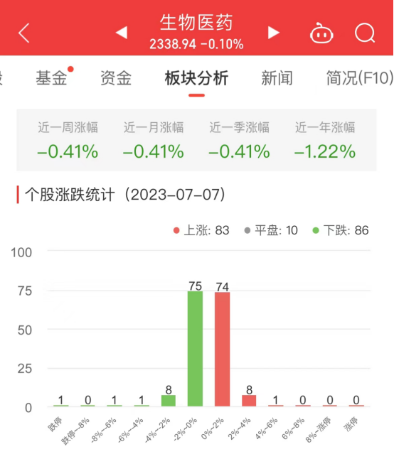 中国经济网北京7月7日讯今日,生物医药板块整体跌幅0.10%,其中83只股票上涨,10只股票平盘,86只股票下跌。