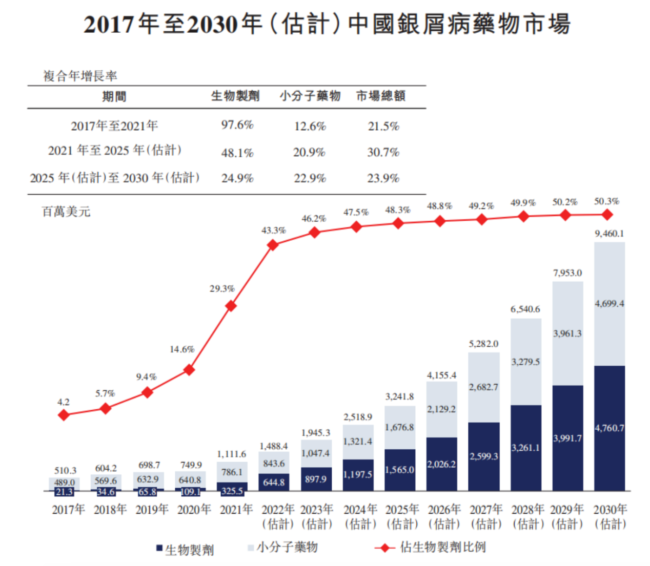 银屑病也称牛皮癣,是一种慢性、免疫介导的、复发性皮肤病,全球银屑病患者约1.25亿人,患病率可达 2%-3%。根据银屑病基层诊疗指南(2022年)流行病学估算,中国银屑病患者人数在700万例以上。其中,斑块状银屑病约占所有银屑病病例的80%~90%,是银屑病中最常见的类型。据弗若斯特沙利文报告,2021年,中国的银屑病药物市场规模为11亿美元,预计于2030年将增长至95亿美元,复合年增长率为27.1%。