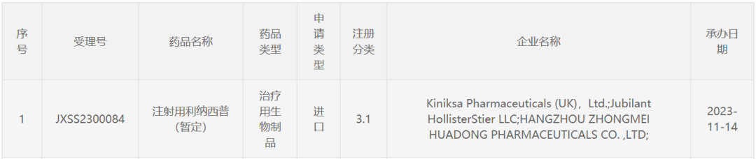 11月13日,华东医药发布新闻稿称,其全资子公司中美华东申报的注射用利纳西普(暂定)用于治疗冷吡啉相关的周期性综合征(CAPS)的上市许可申请获得中国国家药品监督管理局(NMPA)受理。注射用利纳西普为中美华东与Kiniksa Pharmaceuticals全资子公司合作开发的产品,中美华东拥有该产品在中国、韩国、澳大利亚、新西兰、印度等24个亚太国家和地区(不含日本)的独家许可,包括开发、注册及商业化权益。