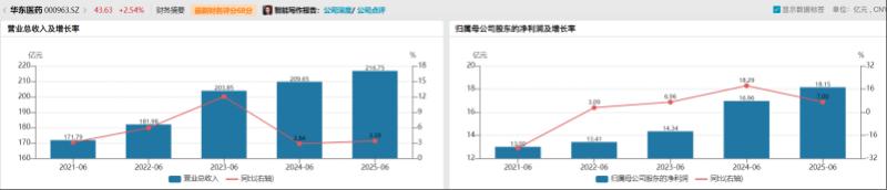 前不久,华东医药披露的2025年中报显示,公司营收同比仅微增3.39%至216.75亿元,自2023年同期保持12.02%两位数的增长后,已经连续两年微弱增长。