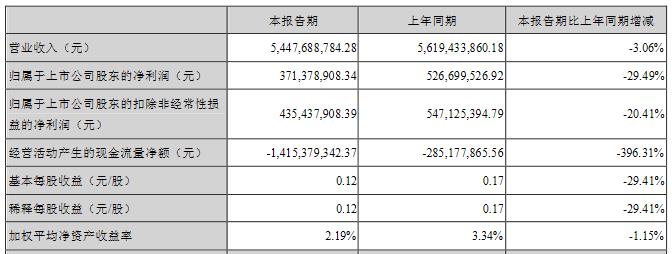 上半年,公司基本每股收益0.12元/股,同比减少29.41%;加权平均净资产收益率2.19%,同比减少1.15%。