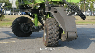 别看这款太阳能清洗机体型大,它可不是“傻大个”!四个车轮均搭载独立的轮毂马达,前进方向与速度可独立自由控制,轻松实现横向、斜向和原地旋转三种运动方式。同时,每个轮胎搭载独立油缸减震系统,在崎岖不平的路况下行驶时,可通过油缸自动伸缩减震调平,使机身保持水平,防止出现侧翻等情况,灵活应对不同路面情况!