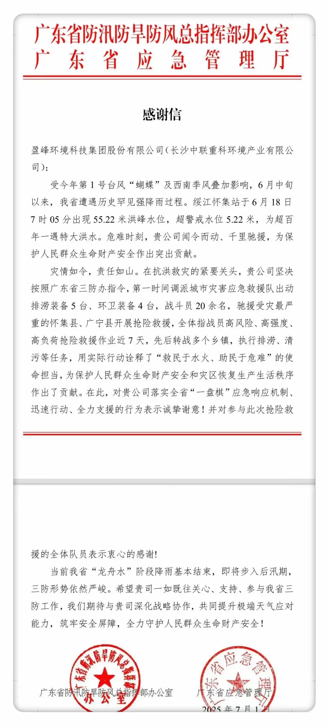 近日,盈峰环境收到广东省防汛防旱防风总指挥部办公室、广东省应急管理厅发来的一封感谢信,对公司驰援怀集特大洪涝灾害中的突出贡献给予高度肯定。